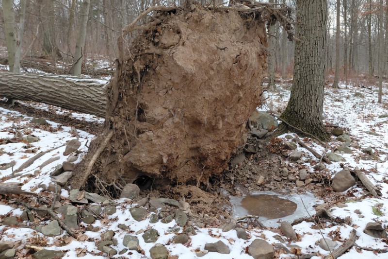 Next time you spot one of these uprooted trees, take note of the huge crater-like void they leave. This void collects water and snow, making it a terrible survival shelter. And look up. Notice the bowling-ball-sized rocks protruding from the fickle soil. Look down to see the rocks that have already loosened and fallen. A drop from that height could injure or even kill a camper below. Fallacy busted!