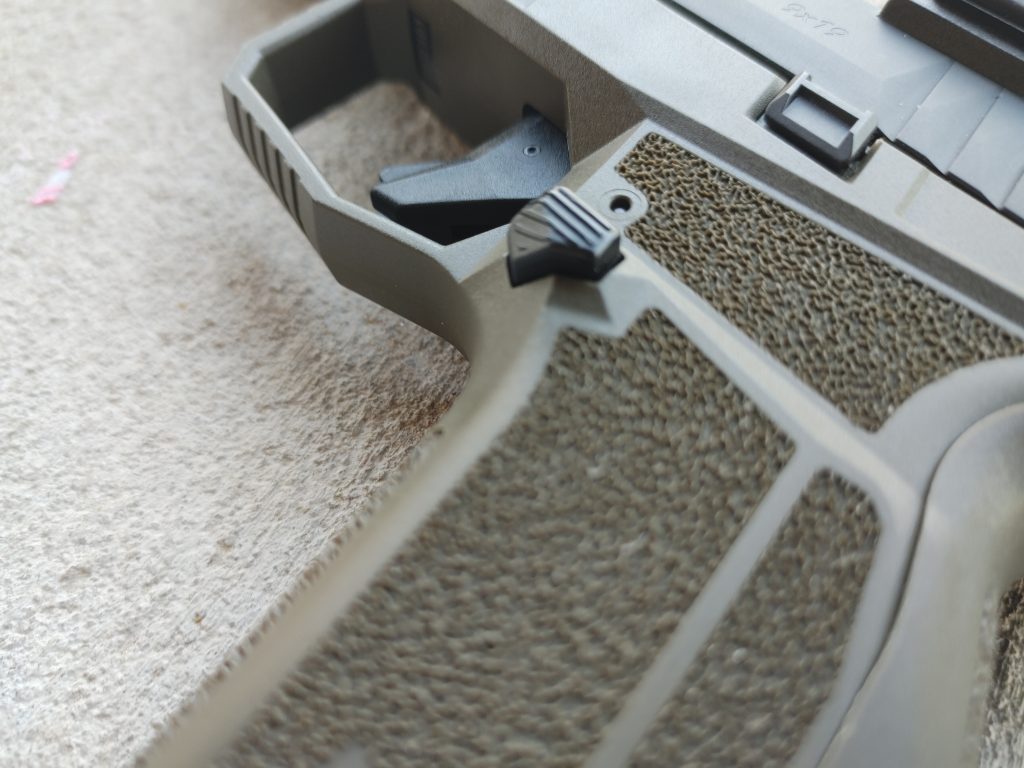 The magazine release is an extended version with the tactical model, and while it’s right-handed, Arex included a left-handed version in the box for an at-home swap. The extended device is an excellent feature, and it really sticks out nice and far for easy engagement and quick mag swaps.