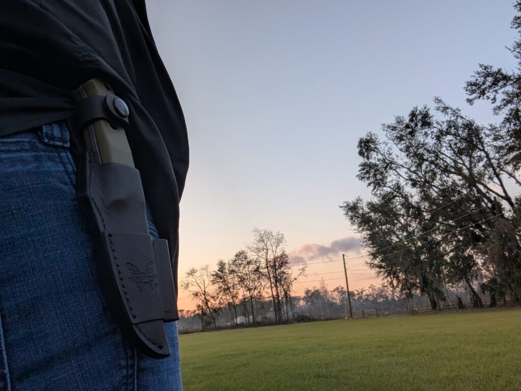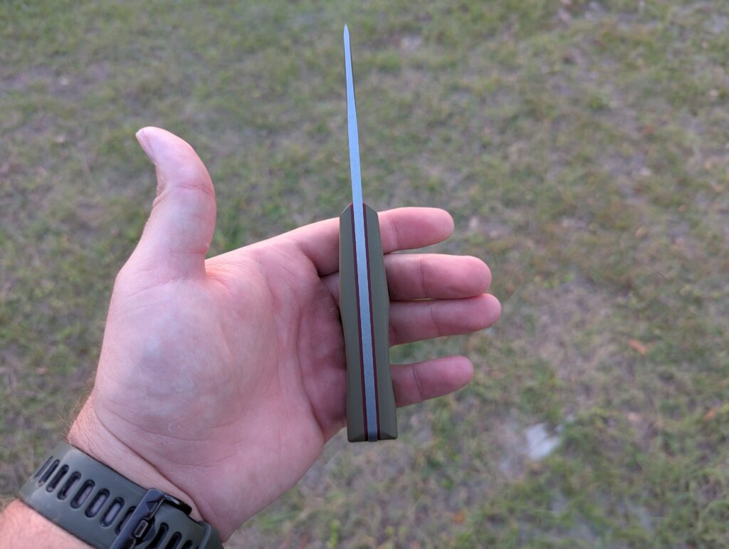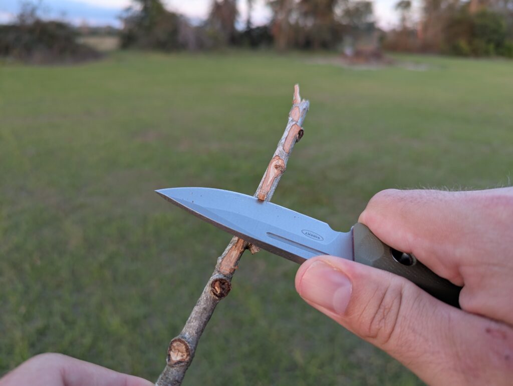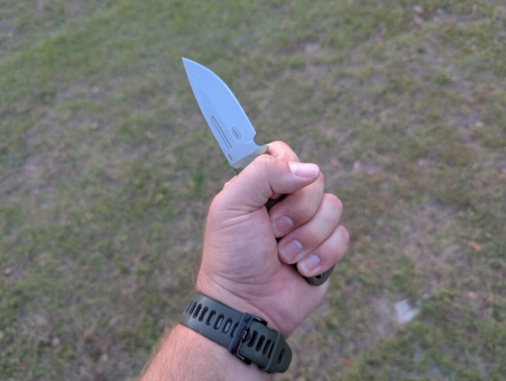 The blade has a fuller, aka a “blood groove.” This helps prevent suction when the knife is stabbed into something. I’ve never stabbed anything deep enough to worry about suction, but hey, I’ll take the extra feature. There is also a notch to insert a Ferro rod. It’s handy and efficient for creating sparks. If your rod doesn’t fit, the spine is squared and strikes a rod easily enough.