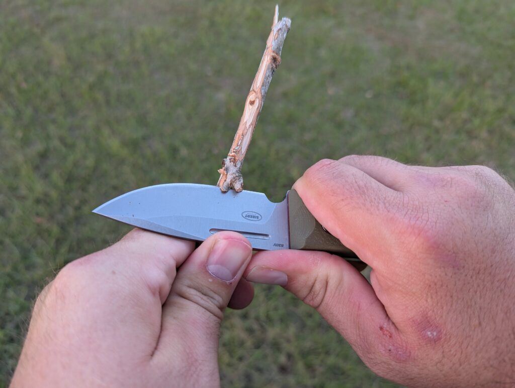 The grip has a rounded nature that feels nice and provides an excellent grip. In using the knife I never had a problem with my hand slipping or sliding. Fatigue rarely set in, and I stripped a cypress branch of its limbs and bark to turn it into fire kindling. The thick handle felt great, and the G10 digs in enough to keep your hand locked onto the knife.