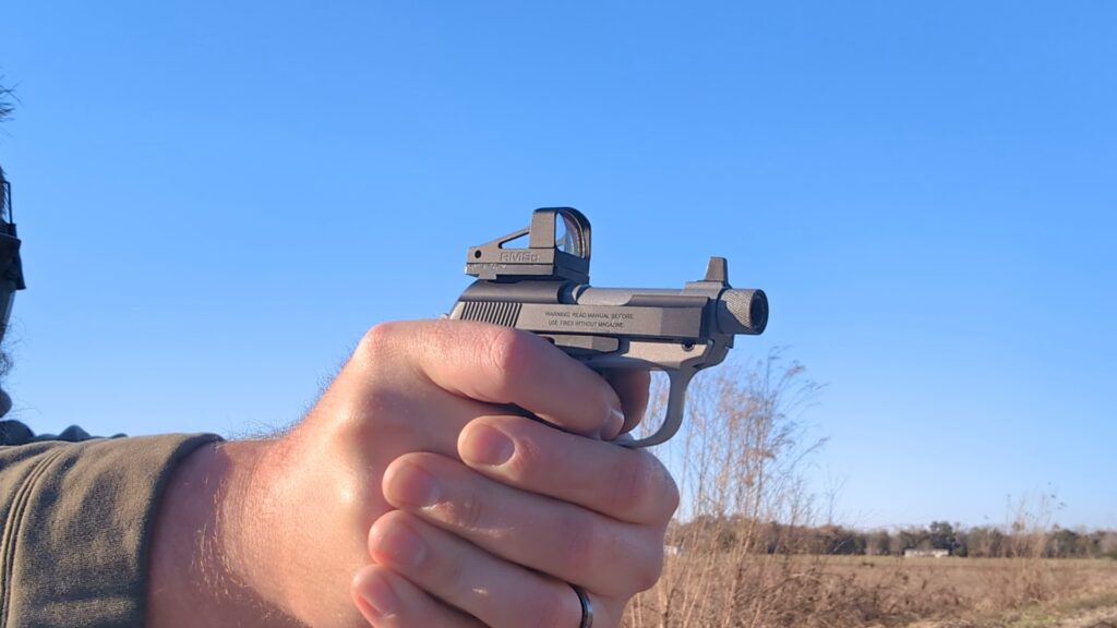 The red dot greatly increased my range and fixed the point-of-aim/point-of-impact issues. I produced tighter groups, roughly three to four inches at 15 yards. At 25 yards, I could land hits consistently on an IPSC target. At 50 yards, I wasn’t 100% accurate, but I hit more than I missed. For a tiny pistol, I’ll take that.