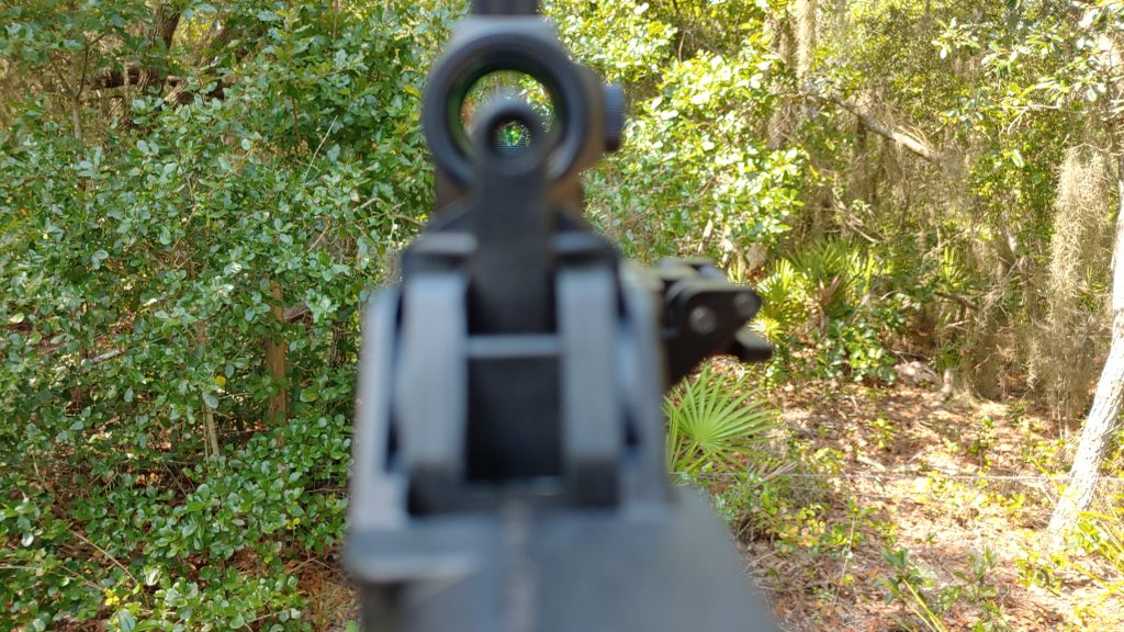 That section of Picatinny rail flips out of the way with the press of a lever. Once out of the way, the gun can then be folded and stored like usual. The rail is long enough to mount an Aimpoint micro-sized optic or a pistol-sized open red dot sight. The optic’s mount places the optic perfectly for the ability to co-witness with the iron sights.