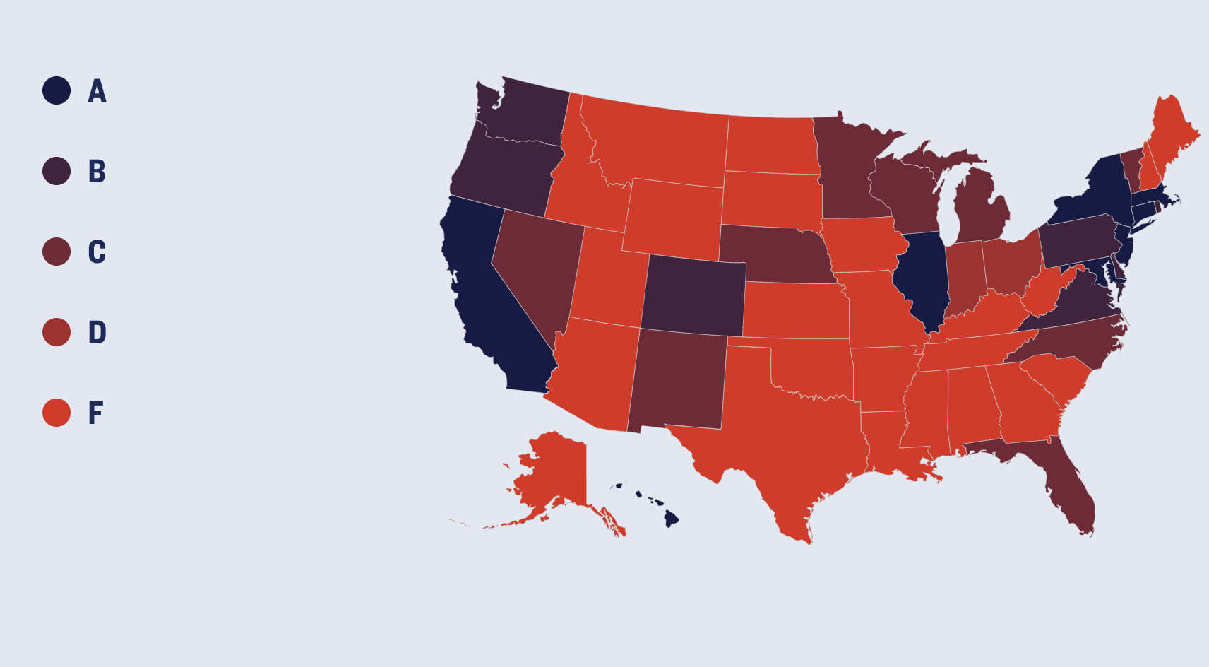 We have 6 F’s and only two A- ratings in the top 20% of states, and 7 F’s and again two A- ratings in the bottom 20%.