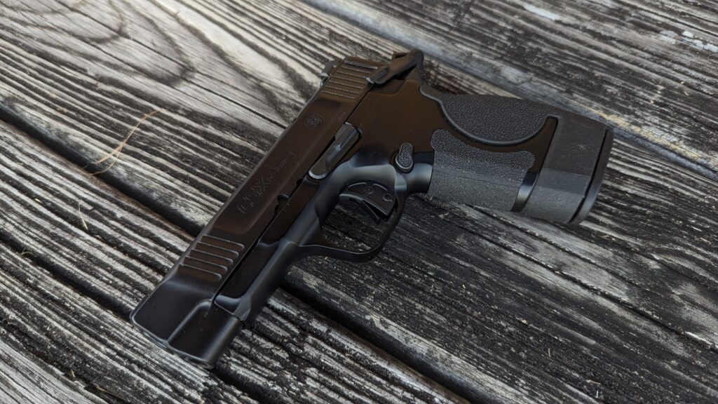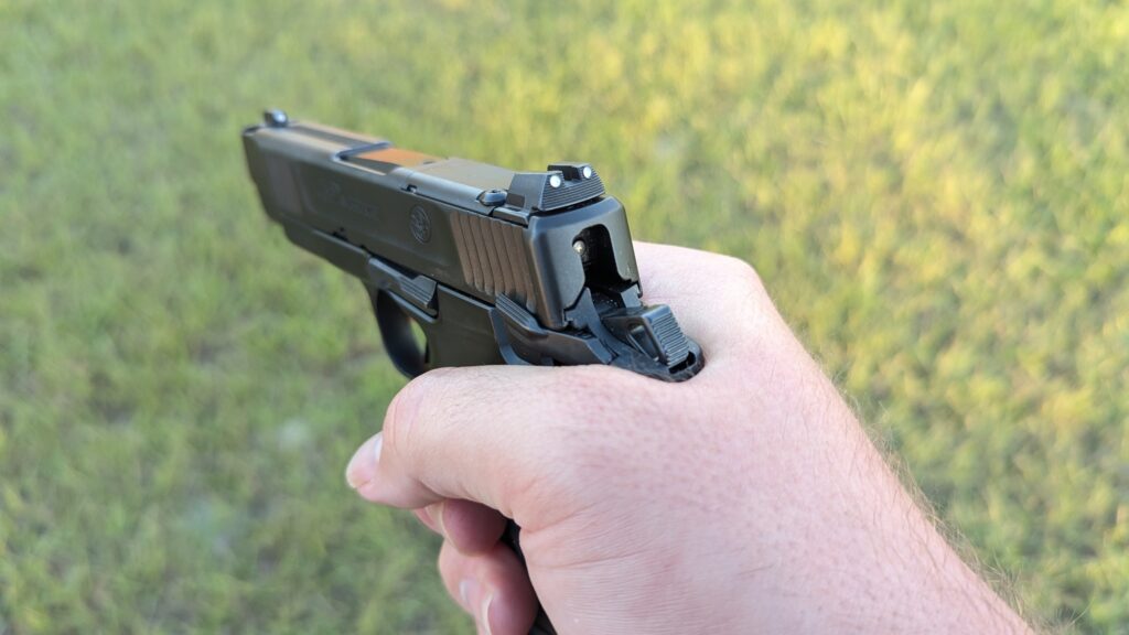 The grip texture is that M&P aggressive, hand-gripping type. It’s beastly and clings to your hand. It’s placed in panels around the grip, and while there is a lot to grip, I do wish the entire grip were coated with this texture. It helps keep the gun positioned in my hand with minimal movement during recoil.