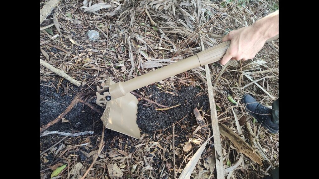 As discussed earlier, the Dredge’s shovel head can be positioned at a right angle to the shaft to convert it into a hoe. This could be used to create a trench for water runoff, planting seeds or crops, or clearing the ground before setting up your tent.