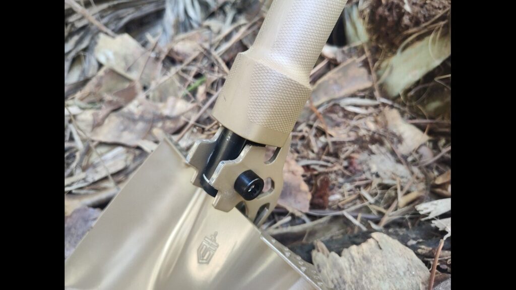 The hardware at the joints allows you to close the shovel with relative ease, all the while keeping the connections tight. A subtle feature is the mid-fold of the shovel head. By stopping halfway when folding the head, you can transform the shovel into a useful hoe.