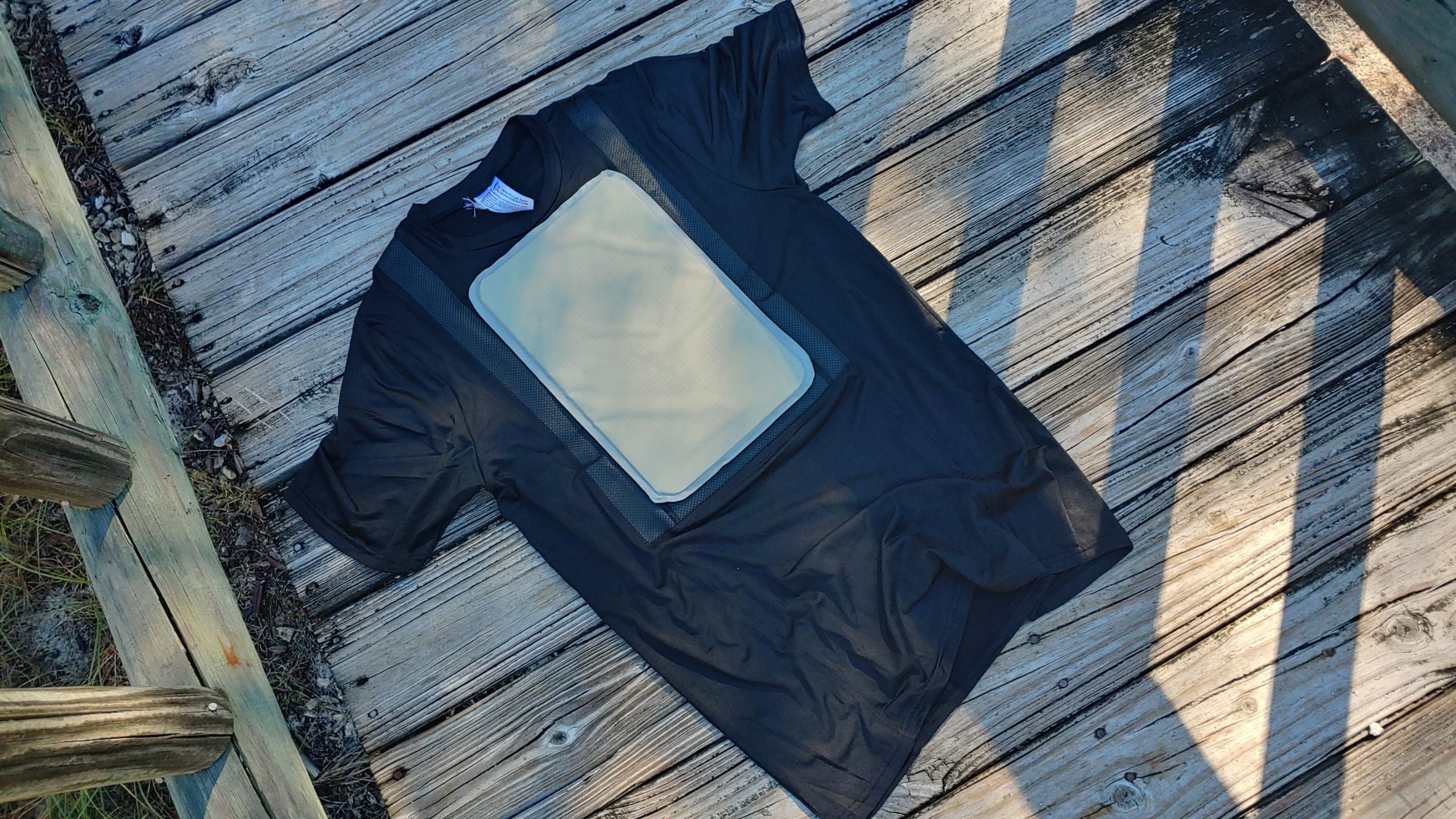 It’s a fairly simple setup. The shirt fits incredibly tightly, much like an Underarmor style sports shirt. The tight shirt holds the panels in place and secures them in one location. The shirt itself is moisture-wicking, fairly lightweight, and breathable. The large panels offer plenty of torso protection, and the tight nature of the shirt keeps them in place.