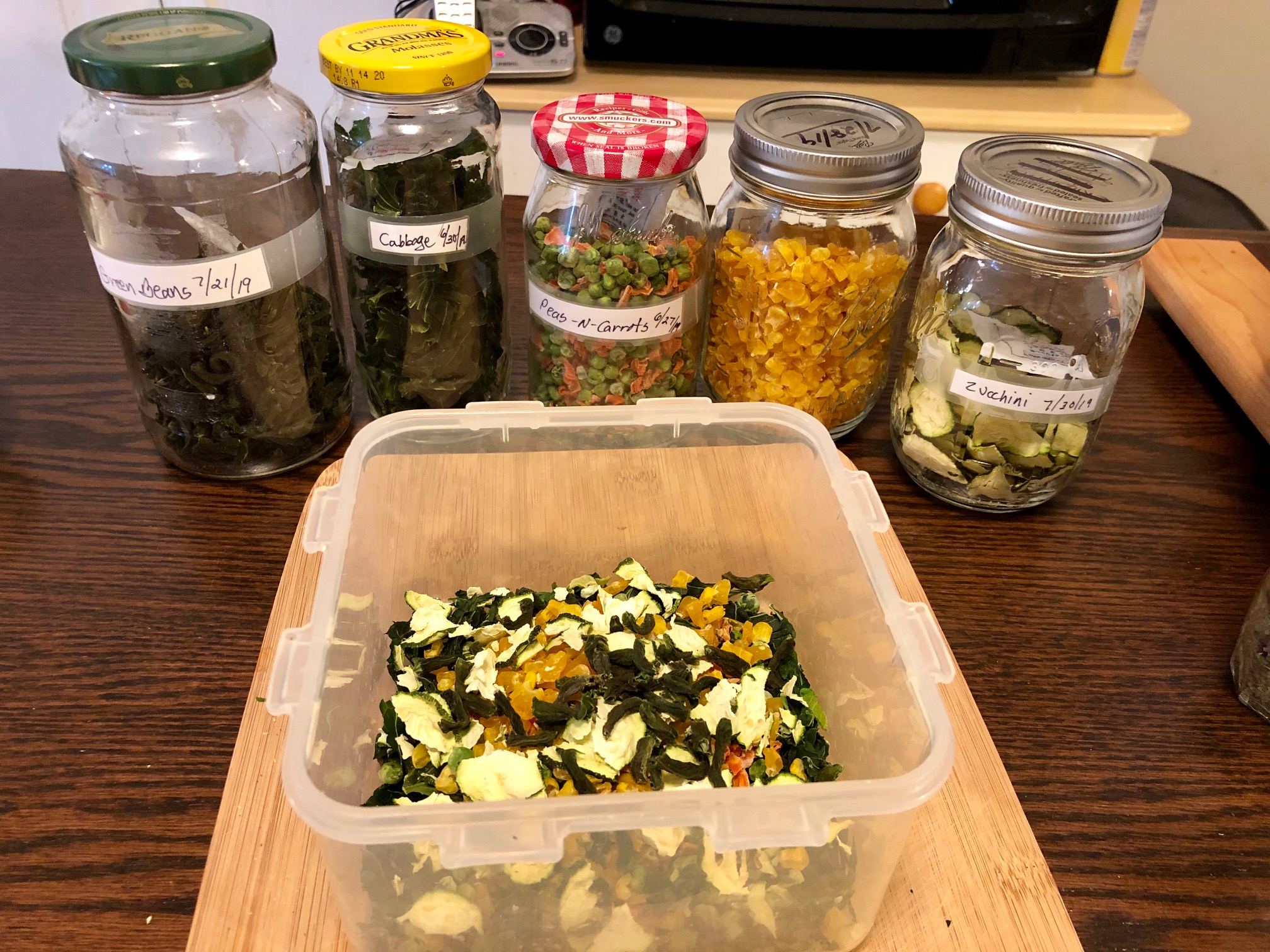 Five pounds of frozen peas and carrots after dehydration fit into two old jelly jars with a desiccant pack each. That’s a lot of freezer space freed up. Multiply that by how many vegetable varieties I like to keep on hand, and pretty soon I’ve saved a small chest freezer worth of space. Not to mention how many commercial cans that would save on my shelf.