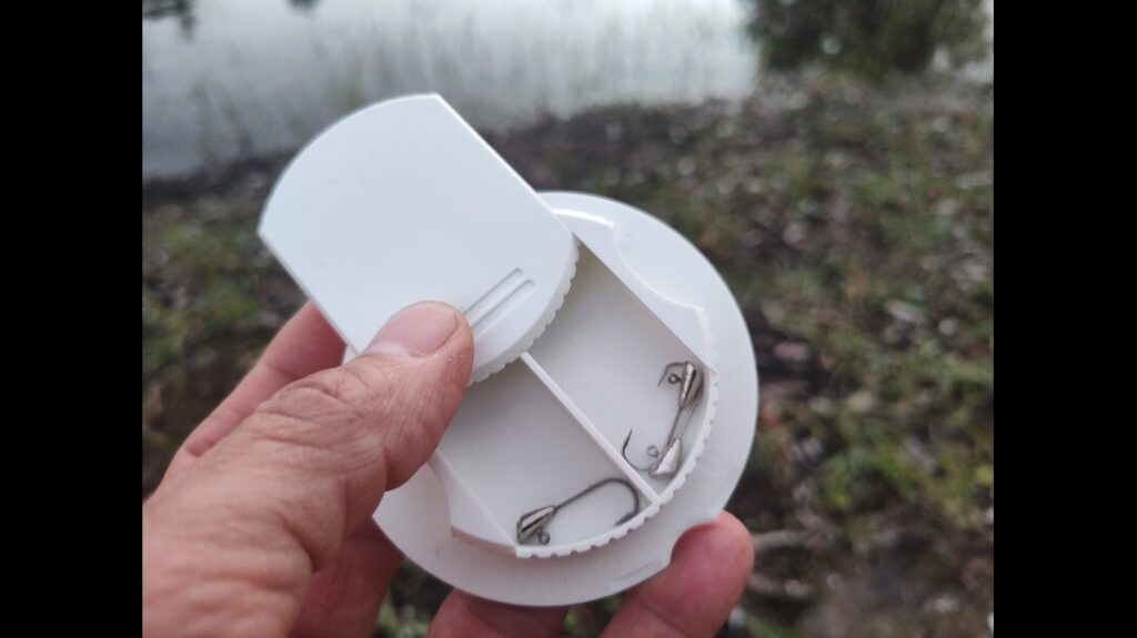 I first twisted off the kit’s cover to reveal the reel, complete with 60 feet of braided line. At that point, I was questioning where everything else was. However, from there I twisted and lifted the white plastic cap to expose the mini tackle kit’s contents. This held soft, rubber worms, lures, and even a lifelike crayfish. Jig heads and floats rounded out the assortment.