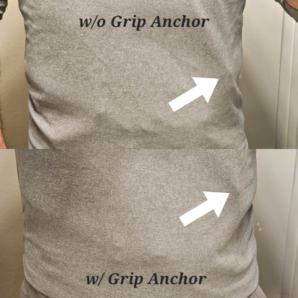 It also claims to make the gun more concealable “by smoothing the rear corner of the magazine and frame that tends to print or poke”. Personally, that was not my experience. Here’s my Gen 3 Glock 19 in a Dark Star Gear Apollo holster, both with and without the Grip Anchor, worn under a performance fabric henley.