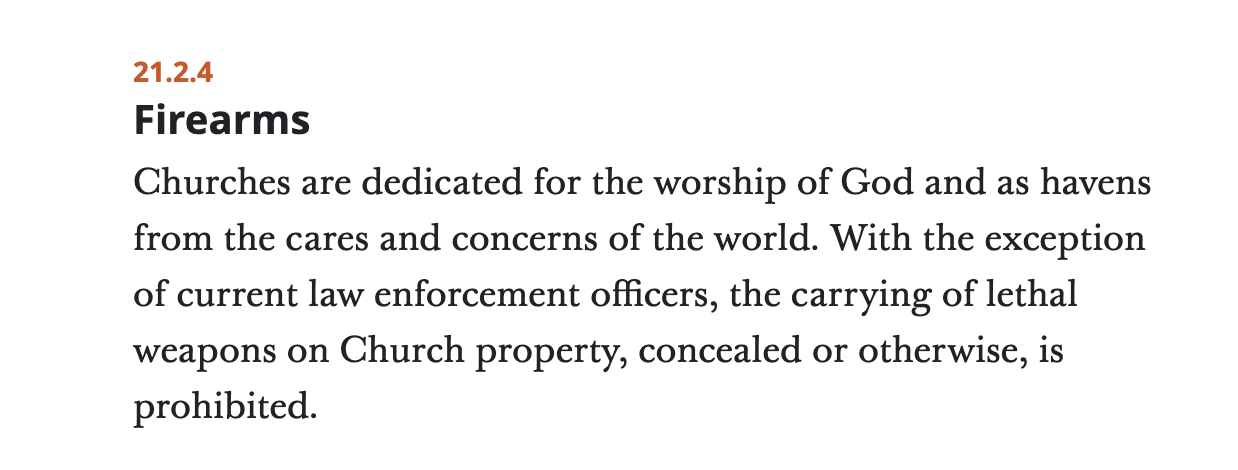 The Church of Jesus Christ of Latter-day Saints has firmly ruled that firearms and other deadly weapons are not permitted within their buildings by anyone who is not a current law enforcement officer. No guns, no lethal weapons for the congregates, period.