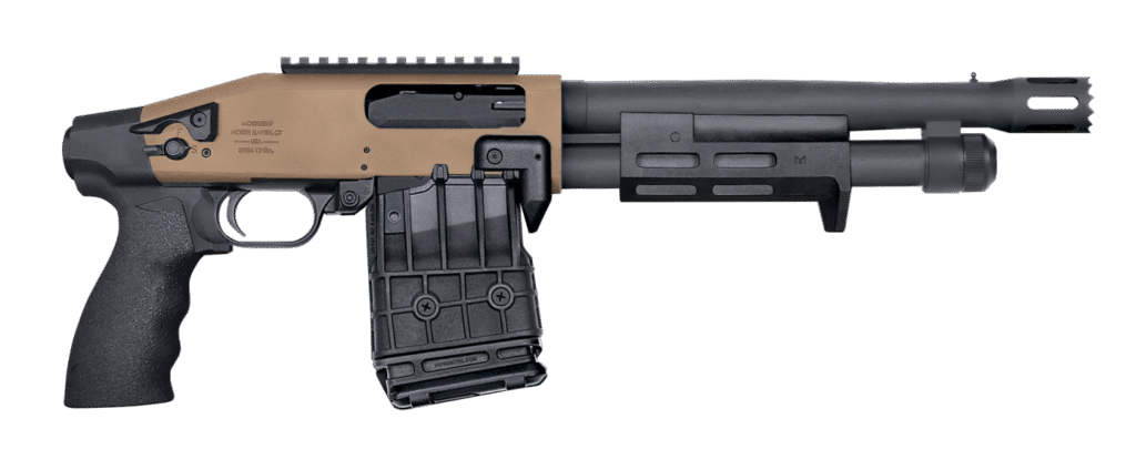 Speaking of NFA items, Mossberg makes the 590M Breacher for the Law Enforcement market. The 590M Breacher is a magazine-fed shotgun using Mossberg double-stack magazines. This allows the gun to be exceptionally short but not limit its capacity. The magazines range from 5 to 20 rounds of 12-gauge ammunition.