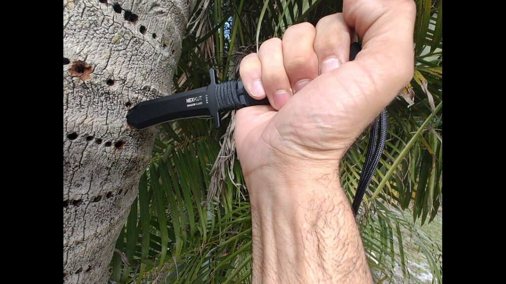 The blade of the NEXKUT Shadow Guard offered a unique design with a top-heavy tip and concave-curved cutting edge. The knife’s full tang construction gave me confidence as I forcibly thrust it into the trunk of a palm tree. It dug deep, nearly an inch into the tree.