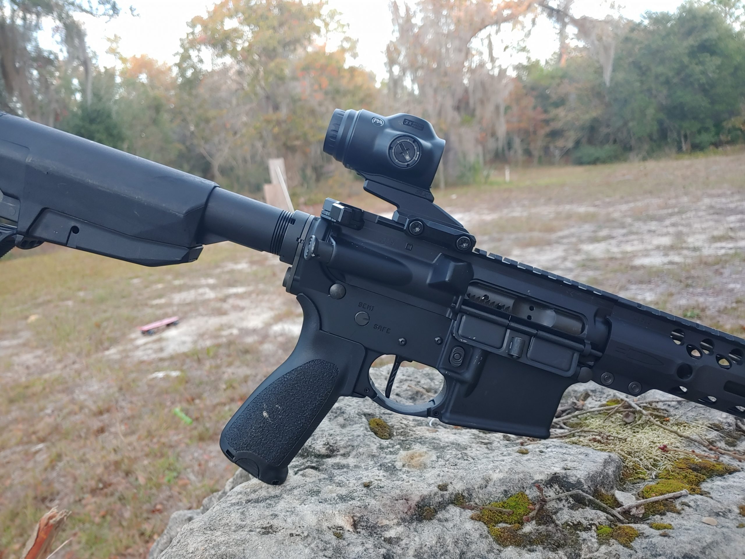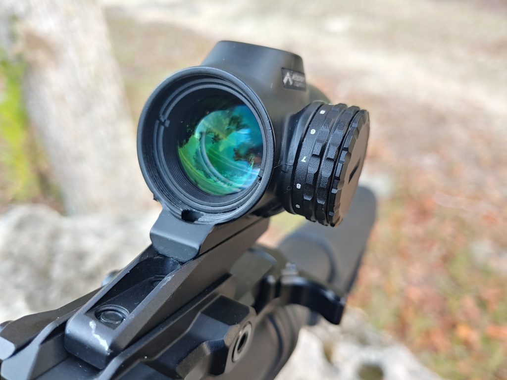 Zeroing was easy, and the clicks were both tactile and audible. It clicks nicely and makes zeroing easy. It didn’t take much to go from high right to dead on, even at 100 yards. The eye relief is tight but not as tight as my old ACOG. You get 2.7 inches to play with, and it’s not insufferable.