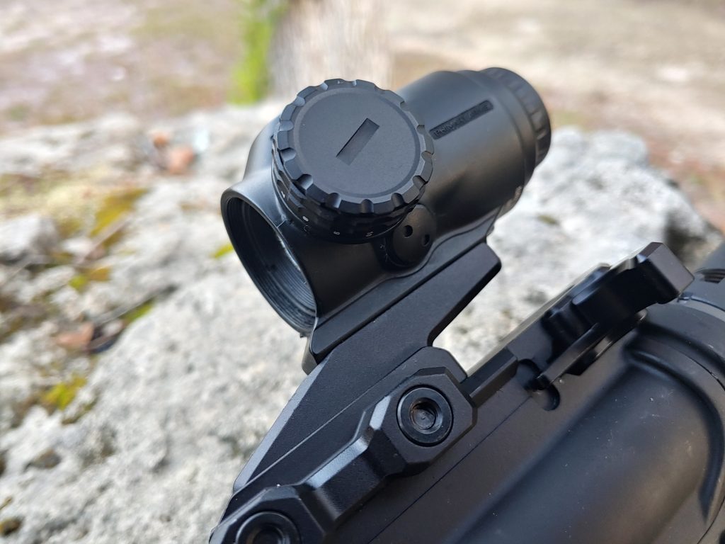 Open both eyes and focus with your non-dominant eye on the target. This takes some practice and isn’t 100% precise, but it allows you to put rapidly fired rounds into the torso of a target quickly and efficiently. I wouldn’t try to take a headshot with it, but in CQB, you can make it work. The MicroPrism has a very bright reticle, and that does make this close-range shooting method a bit easier.