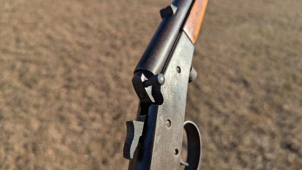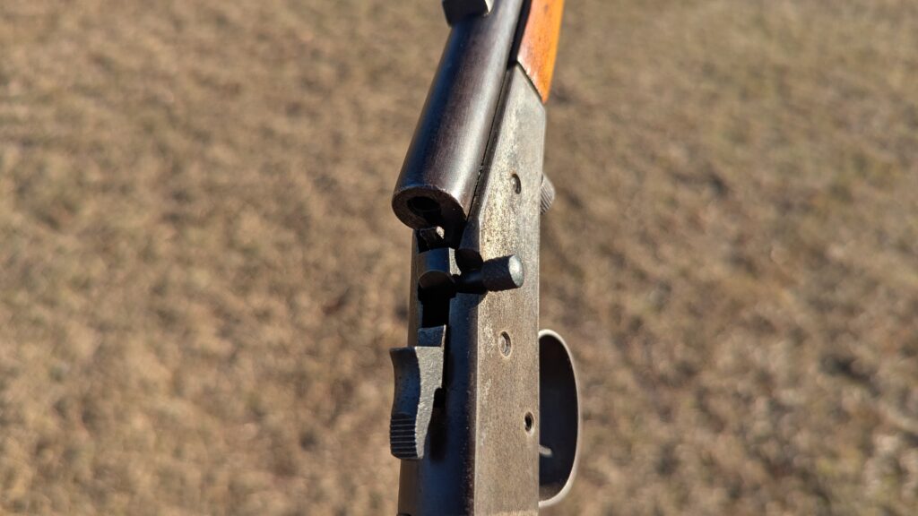 The Little Scout uses a falling block action where the breech block falls downward for extraction and loading. The block comes back up when you’re ready to fire. The hammer is then cocked and drops when the trigger is pulled. This is a robust system that is well-proven and easy to use. It’s tougher than a rolling block, though, with .22 LR, that strength didn’t really matter.