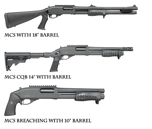 The MCS can be converted into numerous configurations. This includes being able to swap the 18-inch barrel for a 14- or 10-inch barrel. Users can swap the stocks for a standard fixed stock with a pistol grip, a collapsing M4-style stock, and a pistol grip-only version. The magazine tube can be extended to contain up to six rounds. The shortest configuration can hold three rounds.