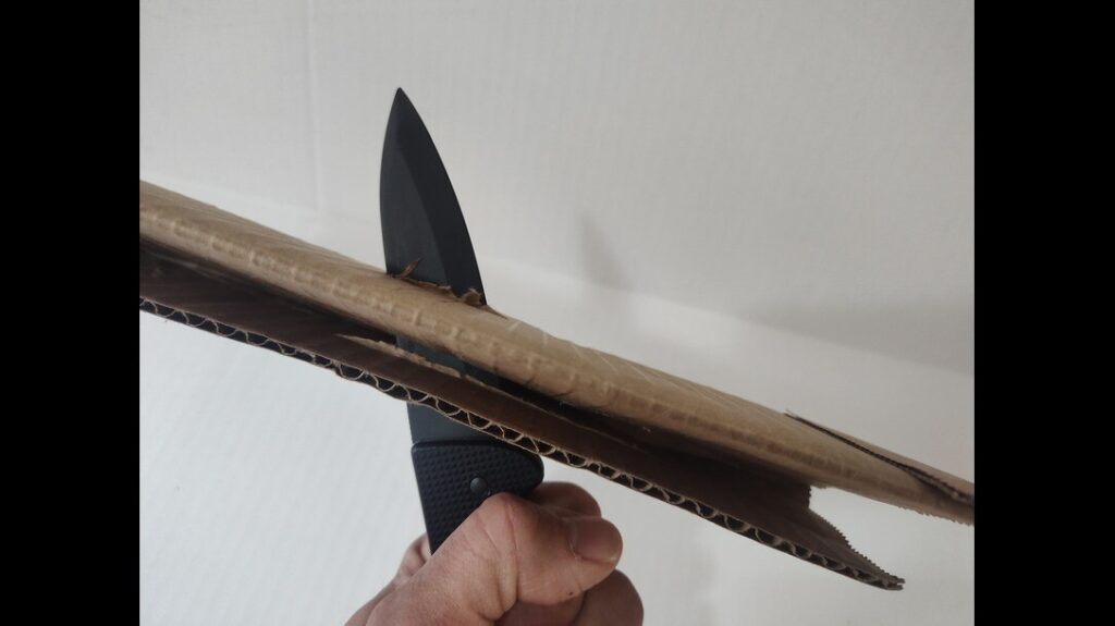 Once started, the knife made its way through. I would recommend using the Evoke on cardboard only when absolutely necessary. Its beefy design is not ideal for this material. The plastic was a true test of both the Evoke’s cutting ability and durable design. The blade lock held firm, along with my hand on the “grippy” handle. The out-of-the-box sharpness of the blade overtook the plastic’s resistance and cut through nicely.