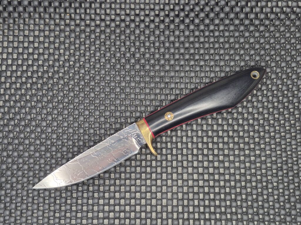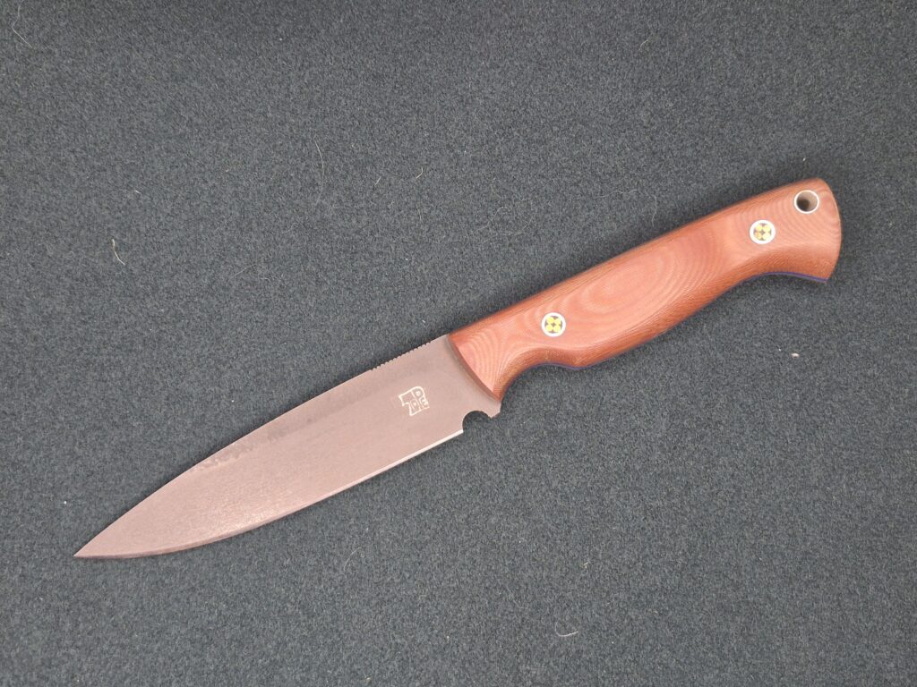 I own several of Alex’s knives, but the Violin is far and away my favorite. It’s just classy. It’s 7.75 inches long, and the blade is 3.5 inches. It features the Night Watch Knives War Wash finish on the steel. This is a surface treatment using a chemical etch. The brass guard really adds some pop to it. I posted a full review of this knife not long ago.