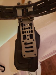 I am running a Blue Force Gear CHLK belt with a BlackHawk Omnivore for my FN509T handgun. Due to running the Omnivore that has a bit of a different hole pattern than other holster systems I did have to purchase the adapter plate. I was actually glad I was running the adapter plate. It allowed me to throw on some more spacers to push it a little bit further from my body. After playing with some placements I decided on the top mounting points and the very furthest forward cant position. Mind you, I have shorter arms so you may have to go lower with your point preference.