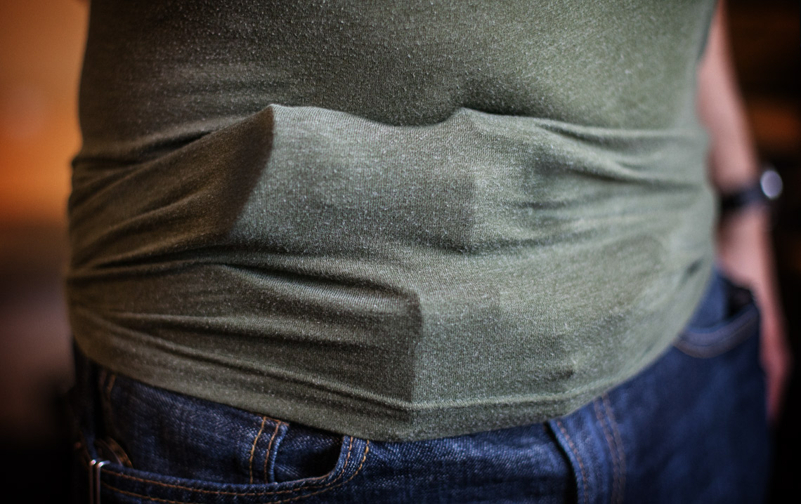 Pant rise is important: For those unfamiliar, “rise” is the distance from the waistband to the crotch of a pair of pants. “Wait, you mean to tell me they’re not all the same?!?!?”. Well no, in fact they’re not, nor is one type universally effective. Depending on your build and the length of your torso, standard (high) or mid-rise pants might be more appropriate for you. The most common mistake that most guys make (again, especially those with the “successful lifestyle body”) is that they wear their pants too low. This can negatively impact your concealment by causing the gun to ride too low and/or create hot spots and discomfort. Your natural waist is typically at the level of your belly button, possibly down an inch or two. Most guys wear their pants on their pelvis, which is too low. The other issue is that wearing pants with the wrong rise too low can impede movement. The crotch of the pant is now lower than it should be, which means your legs are joined further down than they are naturally.