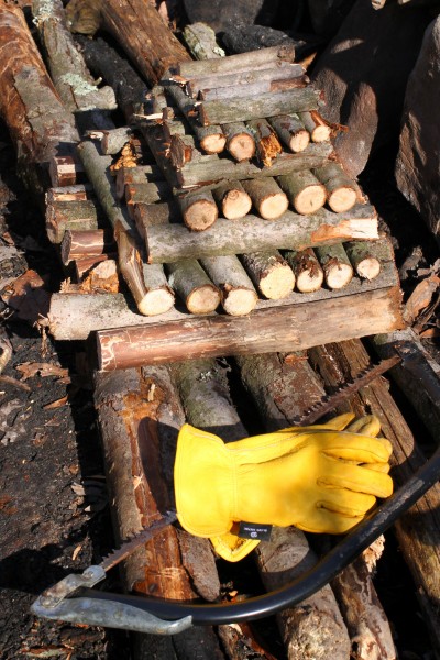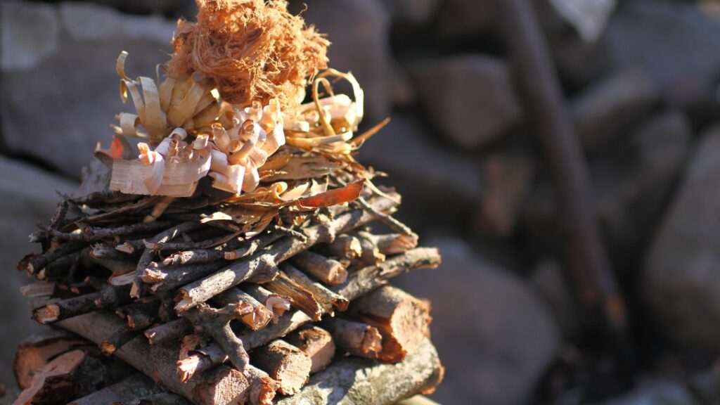 Building a pyramid fire takes patience, clean cuts, and a saw. Lay five to seven thick logs tightly together for the base. Place the next layer perpendicular to the thinner pieces. Keep stacking in that crisscross pattern. Each tier should stay uniform in length and diameter. As you gain height, use smaller fuel until you finish with kindling and tinder on top.