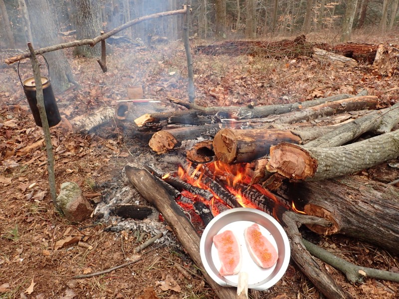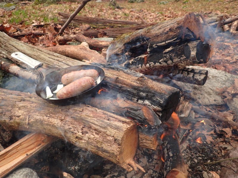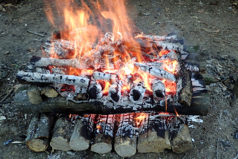 A saw helps a lot. A partner helps even more. Once burning, the pyramid gives you a reliable wall of coals for food on sticks—sausages, bacon, or kabobs on green branches pushed into the ground. Set them near the flame or glowing coals and turn as needed. For serious cooking, coals still rule. Scale the pyramid bigger and let it run for survival warmth.