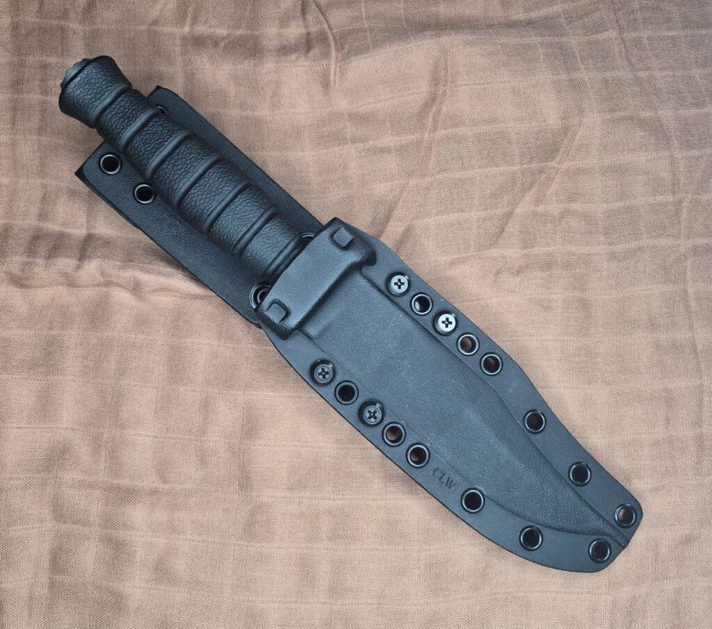It comes with a nicely designed Kydex sheath. It can be attached to PALS webbing as well as hung on your belt. The knife is about as secure as any I’ve ever had in a Kydex sheath. But it’s not a bear to pull the knife out, which is nice.