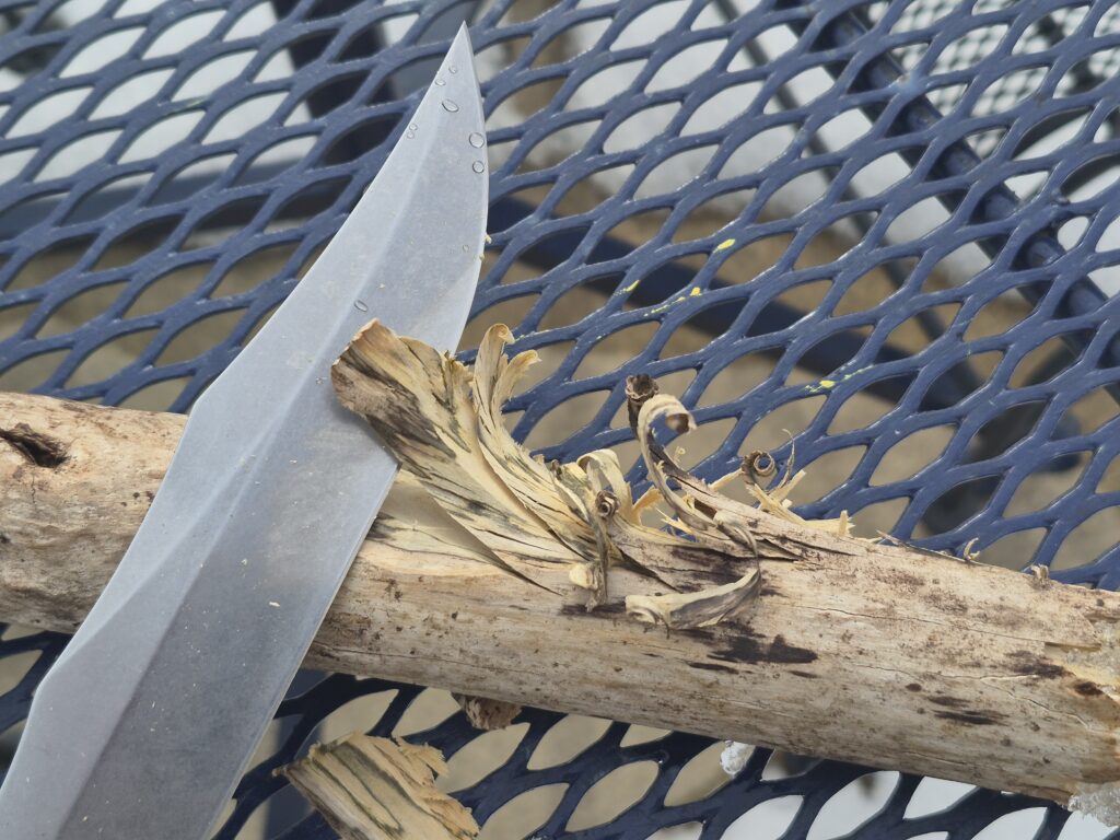 This is a combat knife, but one that will handle other routine knife needs. I started with a thick branch that’s been sitting outside in the snow and ice for the last couple of months. The M320V was able to easily shave bits off. I’ll admit I’m not the greatest with making a feather stick, but I can carve big sticks into smaller ones with the best of them. The knife’s edge bit eagerly into the wood with every pass.