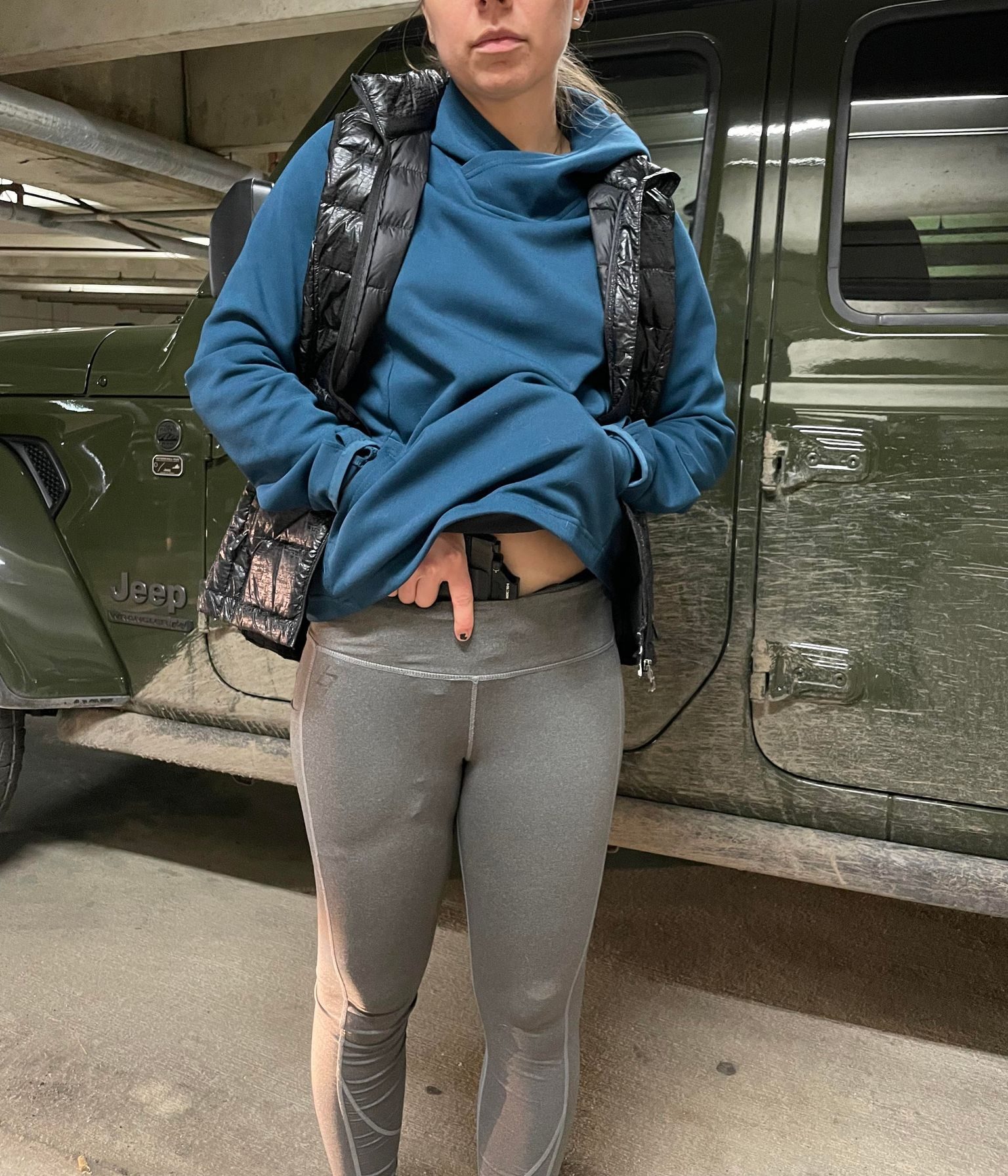 Note: I am 5’2, 125 lbs, and wear a size small. I am also wearing a Phlster Engima in some of the photos which helps with concealability if you don’t want to wear a belt but still gives you your usual kydex holder to safely wear and draw from.