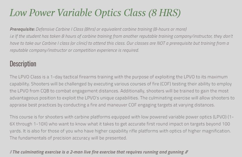 The LPVO course has been held before and received great feedback. See a video from the previous class HERE.