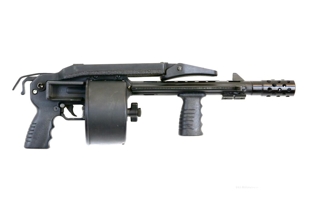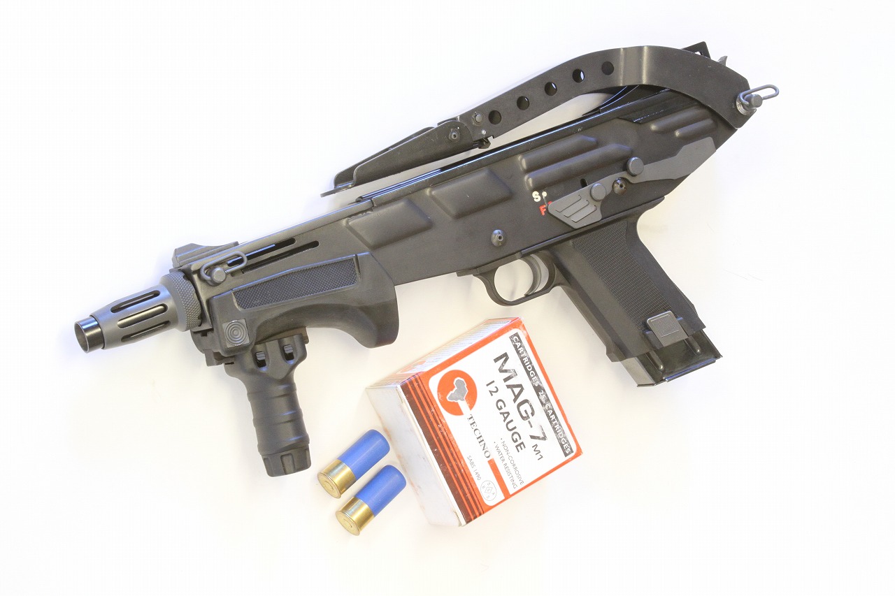 Techno Arms is such a great name for a 1990s gun company. They produced the MAG-7. The MAG-7 is what happens when you want your Uzi to fire shotgun rounds, and I love it, especially the original short-barreled shotgun models. The gun uses a magazine that fits in the grip, and as you’d imagine, it uses a proprietary 12-gauge cartridge.
