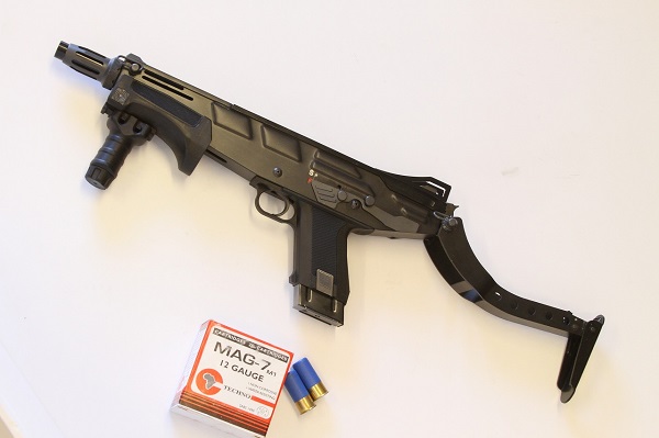 The shells were 60mm long, or approximately 2.36 inches overall. These short shells allowed for a reasonable grip, but they’re still way bigger than most people prefer. A five-round magazine in the grip makes the MAG-7 quite small in its original configuration. A top-folding stock kept the gun compact when necessary, and the 12.6-inch barrel kept things maneuverable.