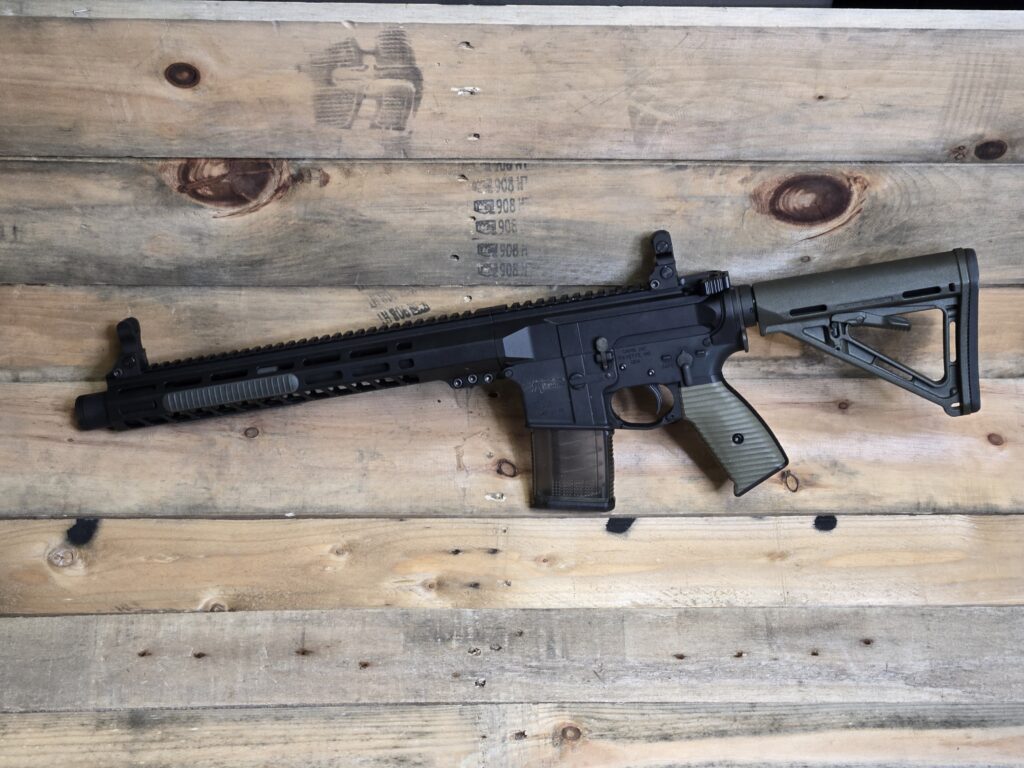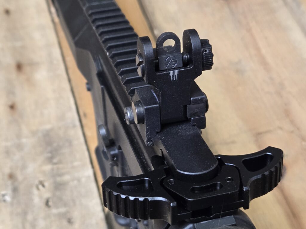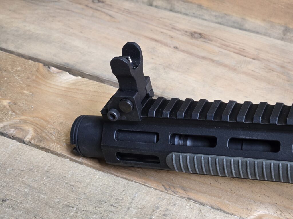 The rear sight has two flip-up options. The one option has a notch for fast, close engagements as well as a small peep designed for a 100-yard zero. The other option is a big A2-style peep. Adjustment on the rear doesn’t require tools and is easily accomplished by the windage dial on the right side of the sight. The front sight does use the included front sight tool to adjust elevation.