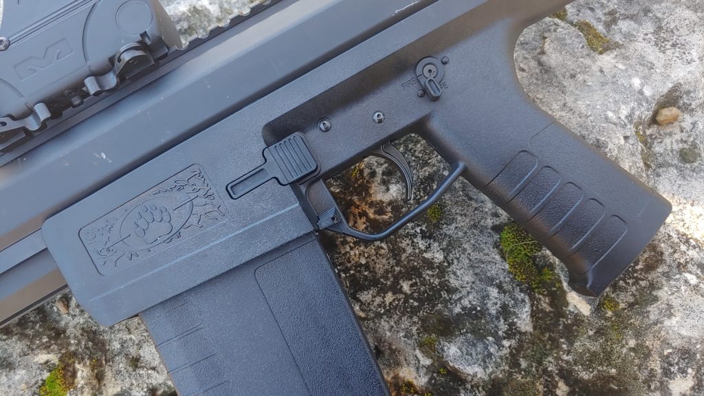 Your carbine feeds from a detachable magazine, as does the Sentry 12. Users get two five-round magazines with the gun, with eight-rounders currently in development. As an American-made weapon, there are no 922R considerations to deal with, so magazines have no limits in capacity beyond practical size requirements.