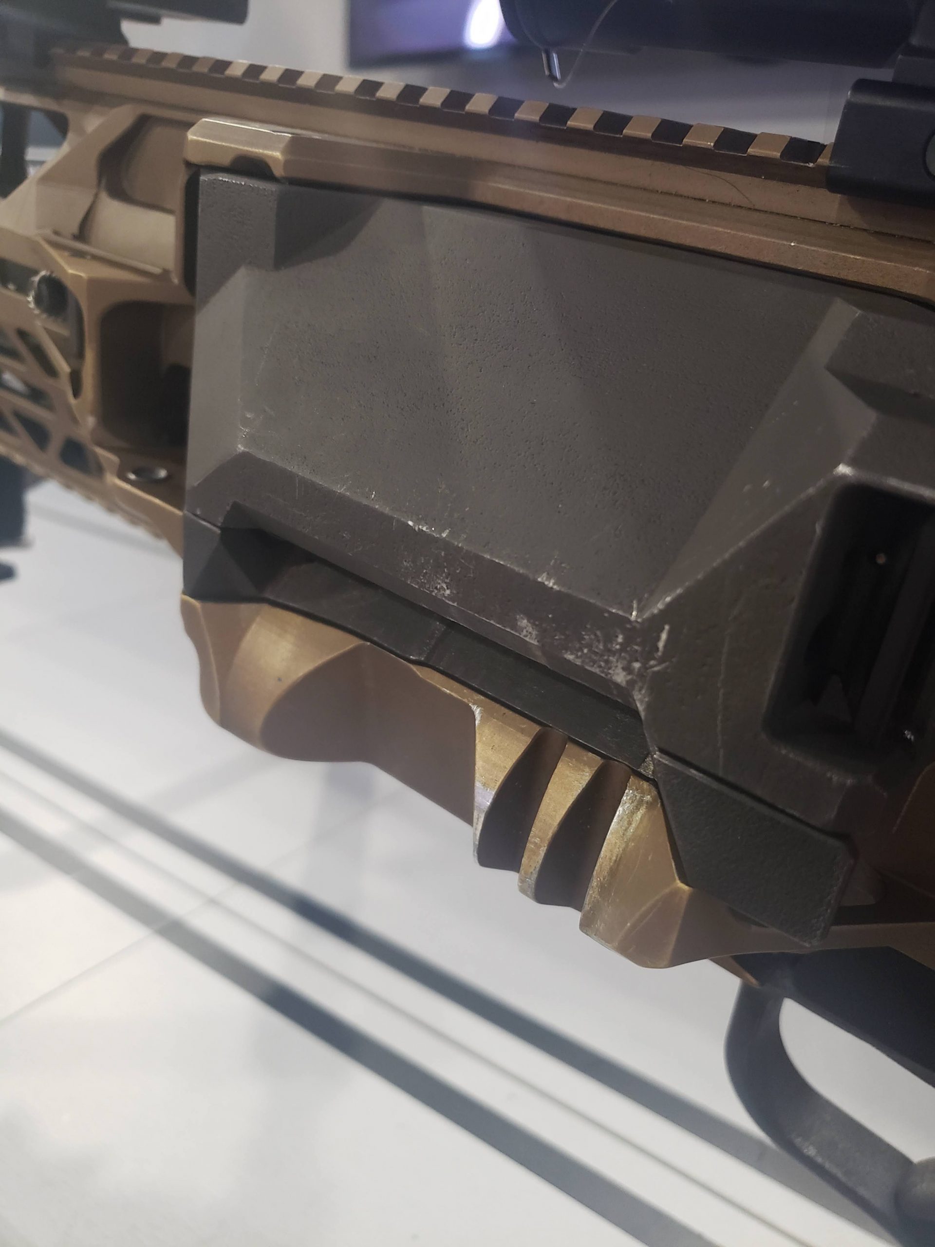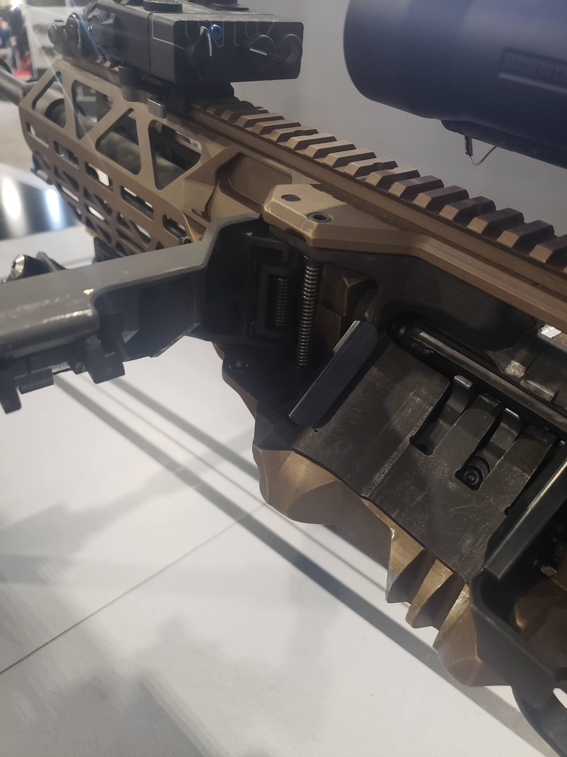The EVOLYS at shot show was shown with FNAmerica furniture. Such as the Magpul Stock, Atlas Bipod, etc. Any other pictures you may see of the EVOLYS may feature more SCAR type furniture due to it being out of Herstal. This is a Herstal made firearm and there are only two in existence. FNAmerica simply kitted the firearm out to look as how it would when it becomes available in the United States. This shows that operators can swap furniture as they need. FNAmerica is also looking at changing the lower receiver components a bit such as adding a pistol grip that can be changed out on user level such as adding a magpul grip.