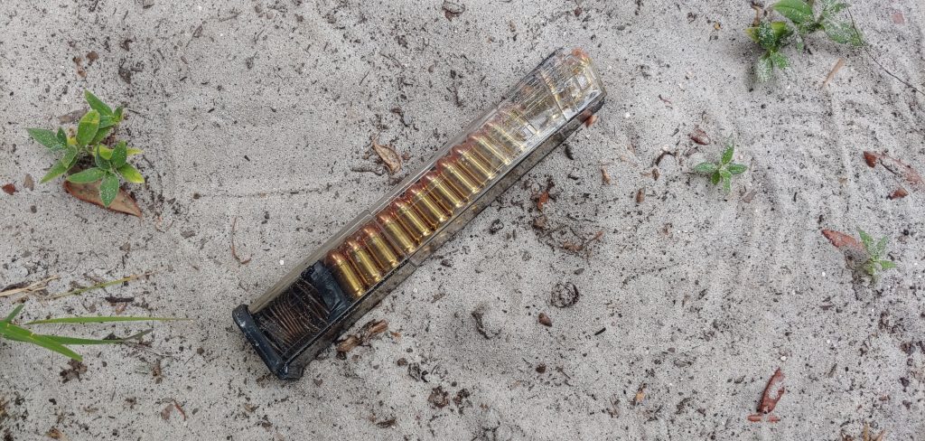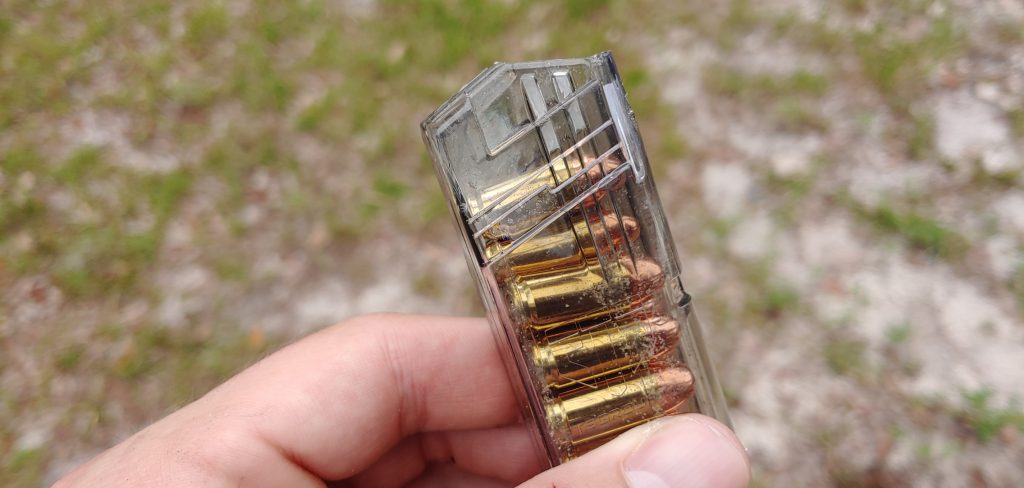 Sadly, it fired one round without a problem, and then the follower failed. It would not rise far enough to feed the rounds to the top of the magazine. I struck the bottom of the magazine hard, and it rose slightly. It was then beat against a tire, and the follower would rise, feed a round or two, and then get stuck again. I slowly unloaded the magazine and attempted to reload the ETS P320 magazine. I couldn’t load more than one round, and I think it’s safe to say the magazine is dead.